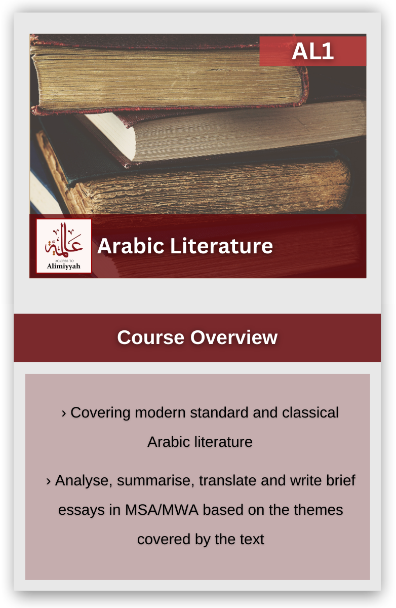 This is a 1 year course covering an anthology of authentic classical texts in the Arabic language titled al-muntakhabat min al-Adab al-Arabi: al-manthur wa al-mandhum. The texts are selected from the Qur’an, hadith, prophetic biography, history and both pre and post Islamic poetry. This exposure will help increase the student’s sensitivity towards understanding the Qur’an and hadith literature. As part of their assessment, students are also required to do a book review in the form of an oral presentation on a selected literary book from the Kamil al- Kilani series.