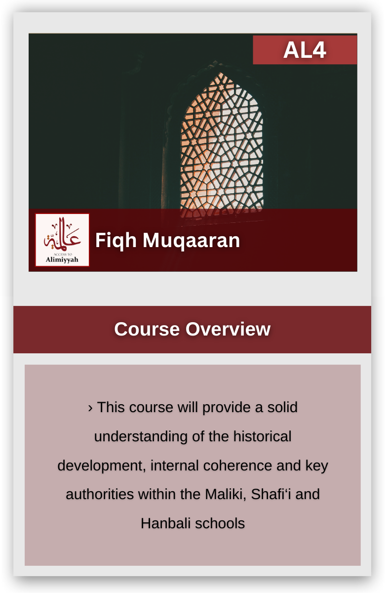 This module follows on from the course of AL2 and AL3 Usul Al-Fiqh. It is a unit in a comprehensive package of modules covering various Islamic sciences including hadith, tafsir, fiqh, aqidah and Arabic literature taught in the Alimiyyah 4 programme.