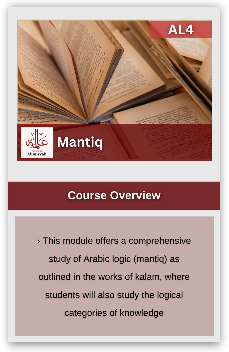 This module offers a comprehensive study of Arabic logic (manṭiq) as outlined in the works of kalām. Students will read the classical premier Husām al-Dīn al-Kātī’s renowned commentary on Al-Abharī’s (d. 630/1265) Isāghūjī (Esagoge), otherwise known in the subcontinent by the name “Qāla Aqūlu”. Isāghūjī outlines the types and perquisites of the logical categories of knowledge (e.g. the conceptions and assents), as well as the methods of their acquisition (e.g. definitions and proofs).