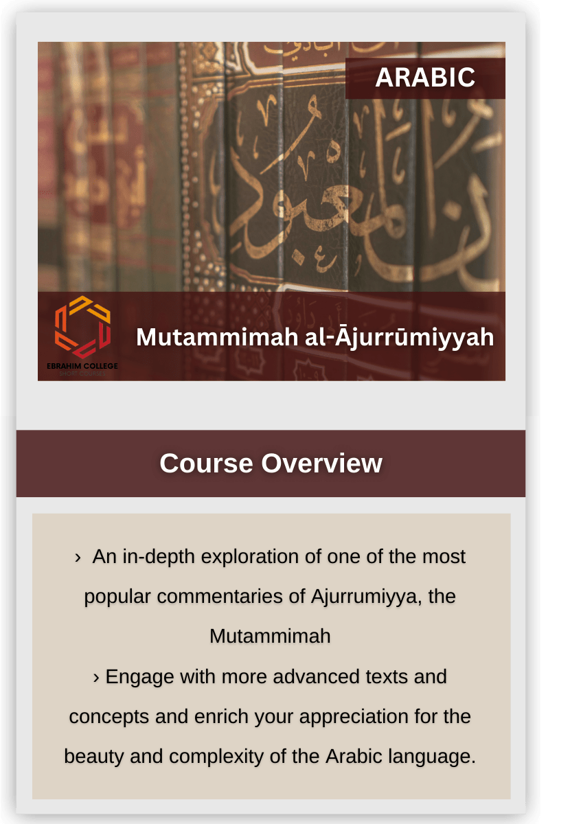 This course will be an in-depth exploration of one of the most popular commentaries of Ajurrumiyya, the Mutammimah.